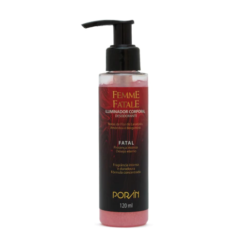 O Iluminador Corporal Fatal Femme Fatale Porán é a escolha ideal para quem deseja realçar a pele com um brilho sutil, sofisticado e com perfume marcante. Com fragrância intensa e concentrada, essa versão combina notas encantadoras de flor de laranjeira, amêndoas e bergamota, oferecendo um toque irresistível que eleva qualquer produção. Ideal para ocasiões especiais ou para o uso diário, este iluminador corporal proporciona luminosidade com leveza e fixação prolongada.